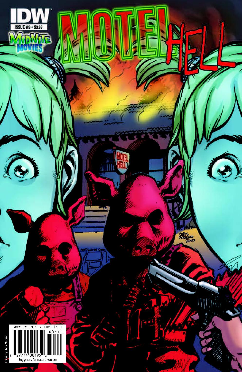 With that, we have talked about Farmer Vincent and his way of killing people to use for his meats as well as the film he is from and that is of course Motel Hell, and now it’s time for us to re-visit the comic mini series that was released by IDW Comics in 2010 as part of there Midnite Movies line, that sadly was very short lived. If anyone from IDW is reading this please bring back this line of comics, as it was great for us horror comic readers who enjoy comics based on films. And I would like to start by thanking Mavericks Cards And Comics, Bell Book And Comic and Game Swap Kettering for making this update possible by having these issues in stock. I would like to also remind you all that I grade these comics on a star scale of 1 to 4 and am looking for how well the comics stay to the source material, its entertainment value and its art and story. So if you are ready, let’s check into our room at Motel Hell and talk about comic books.